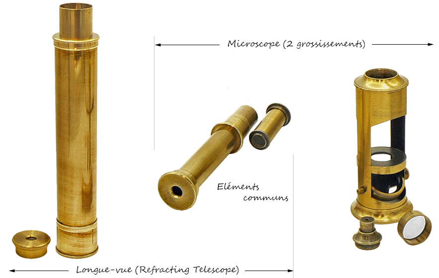 Au centre sont placés les éléments communs à la longue-vue et au microscope, c'est-à-dire le tube oculaire et le redresseur d'image jouant également le rôle d'objectif de faible puissance pour le microscope. A gauche, les éléments propres à la lunette dont une bonnette à filtre très foncé pour l'observation des éclipses du Soleil. A droite, le corps du microscope, l'objectif de plus forte puissance et une cuve à fond transparent pour l'observation en milieu liquide. |