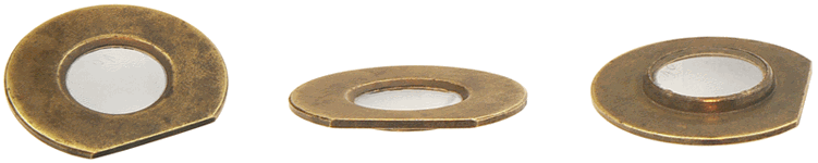 Il s'agit d'une rondelle plate en laiton, de 2,8 cm de diamètre, au centre duquel est inséré un disque en verre. Le plan de ce disque et celui de la rondelle sont légèrement décalés et forment une cuvette dont la profondeur est voisine du millimètre. |