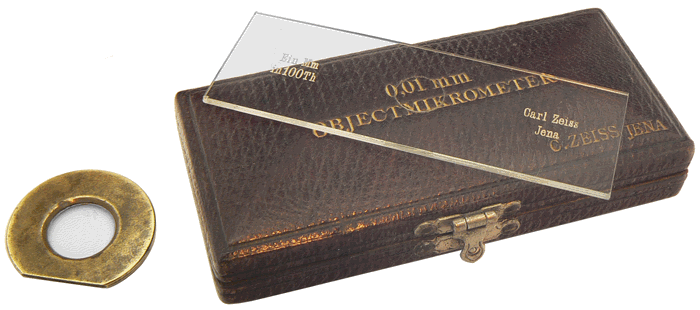 Près du petit accessoire, le micromètre objectif sur lame, utilisé pour la comparaison. Deux photographies ont été réalisées, avec un microscope moderne et dans les mêmes conditions, l'une de la graduation X, l'autre de la graduation en 1/100 mm. Les photographies ont ensuite été disposées bord à bord : |