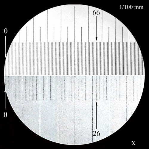 Sur l'image, les traits zéro de la graduation X et de la graduation de référence en 1/100 mm sont en coîncidence. Un deuxième couple de traits, suffisamment éloigné du premier pour réduire l'erreur, remplit les mêmes conditions : il s'agit du trait 26 de la graduation X et du trait 66 de la graduation en 1/100 mm. 1 division