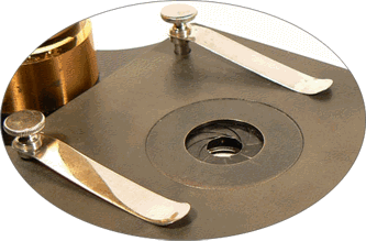 Le microscope est muni d'une tourelle recevant 2 objectifs, d'un condenseur escamotable à hauteur variable, d'un diaphragme iris et d'un porte-filtre pour filtre bleu ou verre dépoli. Un deuxième diaphragme iris, visible sur l'image qui suit, est intégré à la platine. |