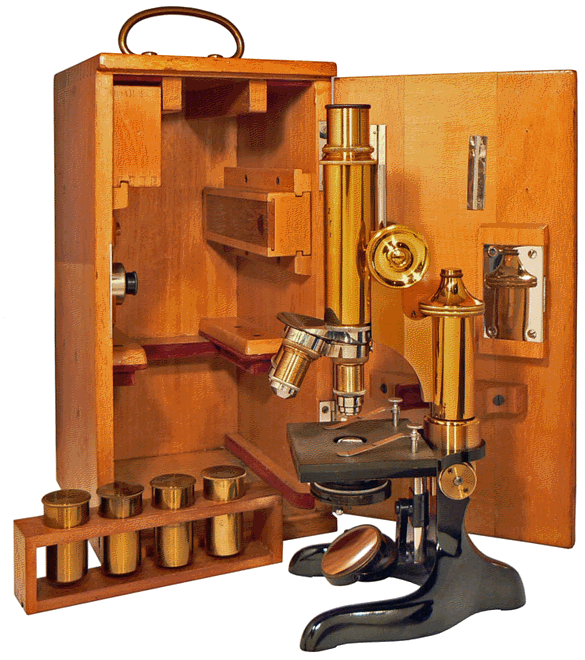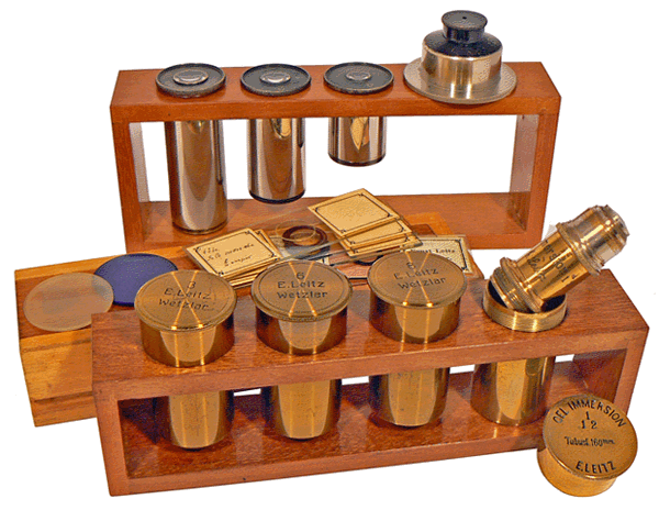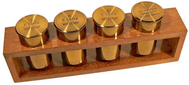 L'instrument est doté de trois oculaires 0, 2 et 4 et de quatre objectifs n° 3, 6, 8 et 1/12 à immersion dans l'huile, l'ensemble permettant des grossissements jusqu'à 1000 fois |