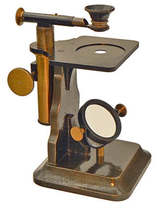 C'est en 1864 qu'Arthur Chevalier présente son microscope dans la première édition de L'ÉTUDIANT MICROGRAPHE dont il est l'auteur. Sur notre spécimen, le bras de potence dans laquelle coulisse le tube optique porte sa signature sans que la mention du grade de docteur n'y figure comme c'est la cas sur tous ses microscopes. Ce spécimen est donc vraisemblablement antérieur à 1870, année au cours de laquelle Arthur Chevalier se vit décerner un doctorat honoris causa. |