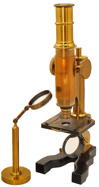 Microscope d'étude, hauteur minimum 28 cm, marqué J. CLARCKE, et loupe sur pied - Probablement France, vers 1900 |