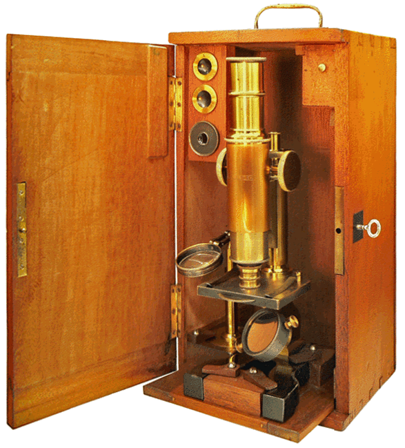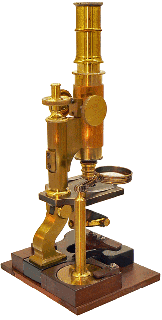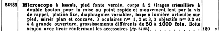 Le corps du microscope est gravé J. CLARCKE, nom à consonance anglo-saxonne : on peut penser qu'il s'agit du constructeur. Toutefois, en 1898, la SOCIÉTÉ DES LUNETIERS propose le même instrument dans son catalogue. En 1908, le microscope est toujours présent : avec une dotation optique permettant des grossissements jusqu'à 1000 fois, il est vendu 180 francs. |
