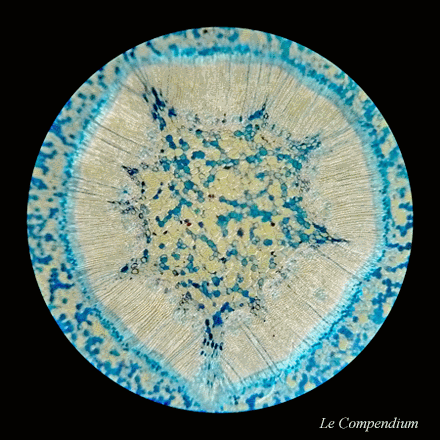 Nous avons testé le microscope en observant une lame contemporaine de botanique. Il s'agit d'une coupe transversale de tige de pin d'une année. Les zones photographiées sous grossissement modéré sont la partie centrale, puis périphérique, de la tige. |