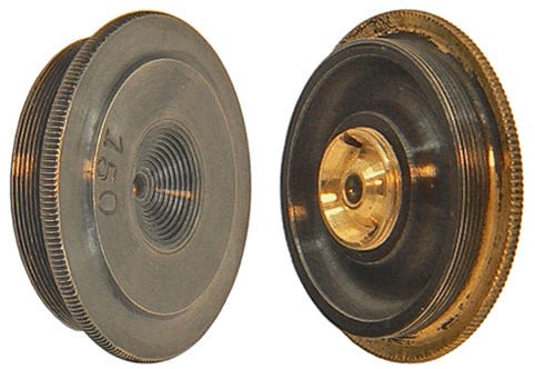 Ces deux images représentent les faces d'un même œilleton. Une première lentille plan convexe est positionnée dans l'axe de la partie massive de cet œilleton. Une seconde lentille, également plan convexe, est sertie dans l'axe d'une pièce cylindrique vissée dans la partie précédente (cette pièce, en laiton poli, est bien visible sur la photographie de droite). Les deux lentilles sont placées de telle sorte que leurs faces fortement convexes soient en regard l'une de l'autre. |