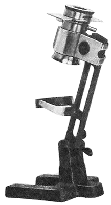En 1929, le coffret contenant une optique correspondant à un grossissement est vendu 12,50 RM. Chaque optique supplémentaire coûte 6 RM. Le Reichsmark (RM) était l'unité monétaire allemande entre 1925 et 1948. L'image de droite correspond à un support permettant de tranformer le petit instrument en microscope de table... |