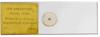 Quelques lames préparées par John Benjamin Dancer, opticien à Manchester, fabricant d'instruments scientifiques (1812 - 1887) et pionnier en matière de microphotographie, sont déjà présentes dans le Compendium. Il s'agit, ici, d'un nouvel ensemble de quatre spécimens appartenant à la même série qui comprenait, vers 1870, une centaine de titres. Ces quatre lames accompagnent, dans un coffret en bois et carton dont nous ignorons l'origine, un microscope de poche d'excellente qualité utilisant un doublet de Wollaston et offrant un grossissement d'une cinquantaine de fois. Les images de présentation des lames microphotographiques qui suivent sont obtenues avec un microscope plus "actuel" et en utilisant divers grossissements. Nous revenons sur le coffret et le microscope de poche à la fin de la page... |