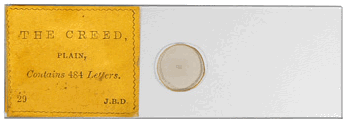 Ces deux photographies au grossissement de 400 fois représentent, à gauche, une partie du texte de "The Creed" microphotographié par Dancer et à droite la surface correspondante d'un micromètre objectif au 1/00 mm. Les deux photographies sont réalisées dans des conditions identiques. A droite, chaque petite division du micromètre vaut 0,01 mm. On peut évaluer à 0,02 mm la hauteur des petites lettres sur le texte de gauche. Même fortement grossies, elles sont nettes ce qui rend le texte parfaitement lisible. |