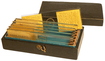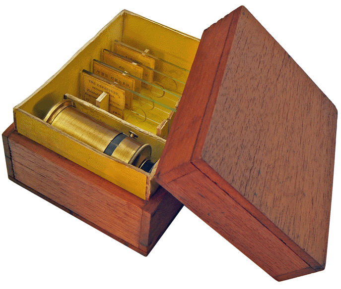 Les quatre lames accompagnent un microscope de poche de fabrication particulièrement soignée et doté d'un doublet de Wollaston. L'ensemble est rangé dans une petite boîte en bois de 11,5 x 9 x 7 cm dont le cloisonnement intérieur est réalisé en une sorte de carton obtenu par contrecollage de nombreuses couches de papier formant des épaisseurs atteignant 3 mm. Les éléments finis, remarquablement bien découpés puis assemblés, immobilisent et protègent les lames et le microscope. Il peut s'agir d'une réalisation artisanale. On observe, toutefois, une similitude entre la couleur des faces du carton et le jaune typique des étiquettes portant les trois lettres J.B.D... Une sorte de coffret-découverte ? |