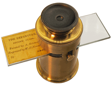 Si les premières microphotographies ont été produites par J. B. Dancer en 1839, René Dagron, reprenant l'idée, fit breveter le procédé vingt ans plus tard. Il combina le "microfilm" et la lentille de Stanhope en collant le premier sur la face plane de la seconde : ces lentilles étaient ensuite insérées dans des supports variés, bijoux, objets religieux, porte-plume, etc. pour offrir, à l'observateur visant à travers la face fortement convexe, des images agrandies. |