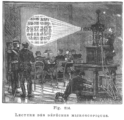 Dagron s'est surtout illustré pendant le siège de Paris de 1870 par la réalisation de correspondances microscopiques qu'un pigeon pouvait emporter sous son aile. Les messages étaient lus par projection : |