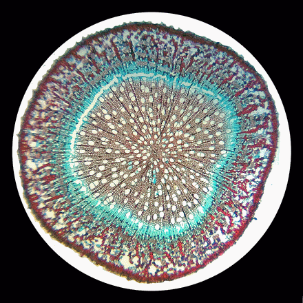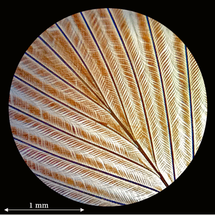 Nous avons testé l'instrument en observant, au même grossissement, deux préparations. D'abord une lame de la fin du XIXe siècle, très classique et montrant une plume de colibri, puis une lame de botanique plus récente présentant la coupe transversale d'une racine ligneuse. |