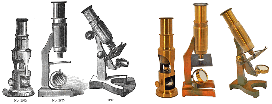 Une présentation, à côté d'autres modèles présents dans le Compendium, comme sur le catalogue BUSIEST HOUSE IN AMERICA de 1896. Le prix des instruments, destinés aux amateurs, varie entre 3 et 10 $ selon le modèle et les caractéristiques optiques. Les trois modèles ont probablement été fabriqués en France et importés aux Etats Unis... |