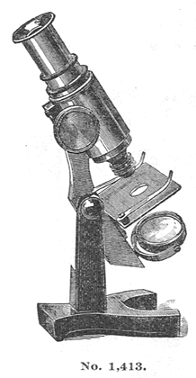 Un peu plus tôt, vers 1890, on le trouve, parmi les instruments français, sous l'appellation "microscope de naturaliste". Il est muni, ici, d'un dispositif de mise au point par pignon-crémaillère. |