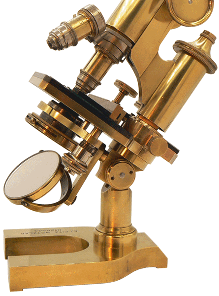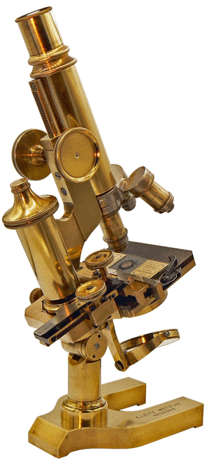 Le microscope est muni d'une tourelle recevant 3 objectifs. Sur l'image qui suit, cette tourelle ainsi que la platine mobile ont été supprimées afin de présenter l'instrument dans la configuration initiale du catalogue de 1892 : "MICROSCOPES et Appareils accessoires ERNEST LEITZ - WETZLAR". |