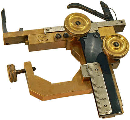 Les deux boutons aux axes de rotation verticaux permettent, l'un, de déplacer la préparation de gauche à droite et l'autre, d'avant en arrière. Chaque bras coulissant est muni d'une réglette graduée en mm se déplaçant devant un vernier au 1/10, fixe. Il est ainsi possible de repérer avec une bonne précision la position d'un point intéressant de la préparation. La vis pointeau à tête moletée permet de fixer le dispositif sur la colonne du microscope. |