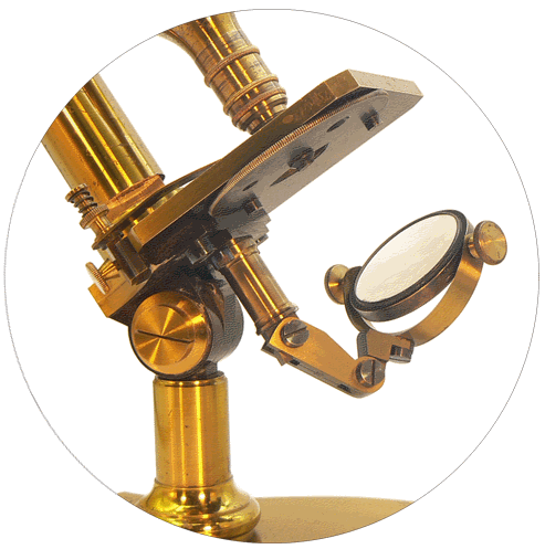 Le microscope petit modèle a été fabriqué de nombreuses années en présentant quelques variantes. C'est dans le catalogue de mai 1872 que l'on trouve l'image la plus conforme à notre spécimen à deux détails près : les valets apparaissent sous la forme classique et l'articulation du miroir est simplifiée. Avec la même dotation optique et en boite d'acajou, il valait alors 200 francs. |
