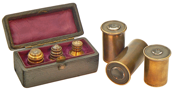 Avec 3 objectifs 1, 3, 5, renfermés dans une "boîte de gainerie", pour reprendre les termes du catalogue Nachet, et 3 oculaires 1, 2 et 3, le grossissement maximum obtenu est égal à 700 fois. |