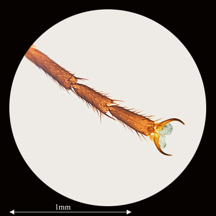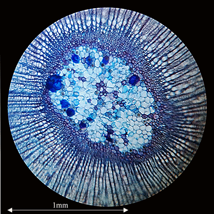 Au faible grossissement (objectif 1 et oculaire 2, sans tirage du tube), il s'agit d'une vue partielle et centrale de la coupe transversale d'une tige de Tilia puis de notre classique terminaison de la patte d'une mouche. |