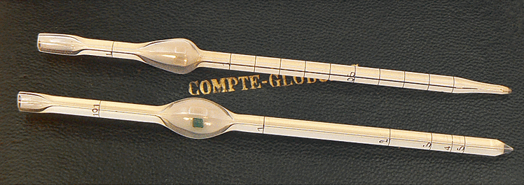 Les mélangeurs de Potain sont des micro-pipettes de précision permettant d'obtenir des petits volumes de solutions titrées. Leur réservoir, dans lequel se forment ces solutions, contient un petit fragment de verre cylindrique servant à brasser le mélange constitué par un faible volume de sang pipeté, après piqure du bout du doigt avec la lancette, et un liquide diluant également pipeté et variable suivant la numération à effectuer. L'un des mélangeurs est gradué pour réaliser les dilutions au 1/10, 1/50, 1/100, 1/200, 1/300 ou 1/400 et est utilisé pour les globules rouges ; son réservoir renferme un fragment de verre rouge. L'autre permet les dilutions plus classiques, par exemple au 1/100, des globules blancs, moins nombreux que les rouges ; son réservoir renferme un fragment de verre transparent. |