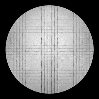 A droite, l'image représente une partie du quadrillage du porte-objet vue au microscope. Chaque rectangle, qu'il soit vide, traversé par des lignes horizontales ou verticales ou encore subdivisé en 20 petits carrés, mesure 0,25 x 0,20 mm et présente donc une surface de 1/20 millimètre carré. |