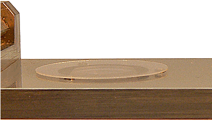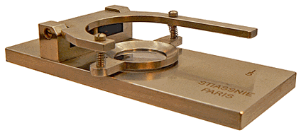 Dans cette plaque est enchassé un disque porte-objet en verre épais. Sa face supérieure, qui affleure la plaque, est gravée de 10 rangées de 10 rectangles. Une rigole circulaire entoure la zone quadrillée. |