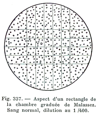 A gauche, le dessin emprunté au PRÈCIS DE MICROSCOPIE de Langeron est un exemple de répartition des globules rouges après qu'ils se soient déposés dans un des rectangles du porte-objet, de 0,25 par 0,20 mm. Pour le comptage de ces globules rouges, on choisit un rectangle subdivisé en 20 petits carrés ce qui facilite l'opération. Sur l'exemple présenté, on dénombre une moyenne de 6 globules rouges par petit carré donc 120 par rectangle. Il s'agit du nombre de globules rouges contenus dans le volume d'un parallélépipède rectangle dont la surface de base est égale à 1/20 millimètre carré (surface d'un rectangle) et la hauteur 1/5 mm (distance entre la surface graduée du porte-objet et la lamelle couvre-objet). Le résultat, 120 globules rouges dans un volume de 0,01 millimètre cube, correspondant à 12 000 globules rouges par millimètre cube, est affiné par comptage dans plusieurs rectangles. Le sang ayant été dilué au 1/400, le nombre doit être multiplié par 400 pour donner, ici, un taux final de 4,8 millions de globules rouges par millimètre cube (ou par micro litre, µL). |