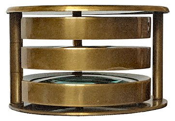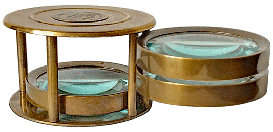 Trois lentilles biconvexes maintenues chacune dans une monture circulaire en laiton forment trois loupes de 5 cm de diamètre, parallèles entre elles, mobiles autour du même axe et offrant le même grossissement, voisin de 2. La combinaison de deux loupes, comme sur l'image ci-dessus, ou des trois, permet de moduler le grossissement. |