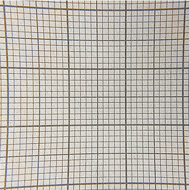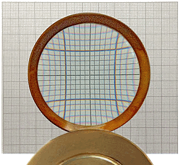 L'image de gauche, obtenue à travers deux loupes superposées, montre la distorsion obtenue pour un œil placé à une quinzaine de centimètres du système optique : l'image apparaît concave. Pour minimiser et aller jusqu'à faire oublier cette "aberration de forme" dans une partie la plus grande possible de l'image obtenue, l'œil de l'observateur - remplacé, ici, par l'objectif d'un appareil photographique - doit se rapprocher des loupes pour agrandir le champ et repousser le phénomène de distorsion vers la périphérie. L'image de droite est obtenue de cette façon, sans modifier la position des loupes et en rapprochant l'objectif. La distorsion, auparavant très prononcée sur le carré de 1 cm de côté, devient à peine visible. La distorsion, qui demeure notable si on considére la totalité de la zone représentée à droite, 3 x 3 cm, est en réalité faible pour un œil "véritable" qui peut se rapprocher davantage de la loupe qu'on a pu le faire avec l'objectif de l'appareil photographique. |