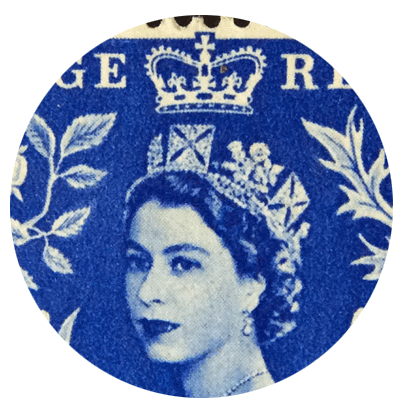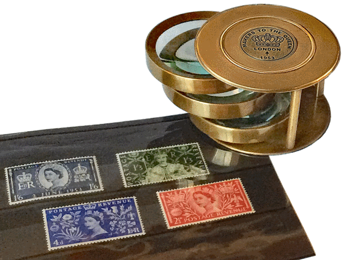 Et, puisqu'il s'agit d'une loupe proposée pour le souvenir du couronnement d'Elisabeth II d'Angleterre, que faire de mieux que d'observer des timbres à son effigie... |