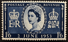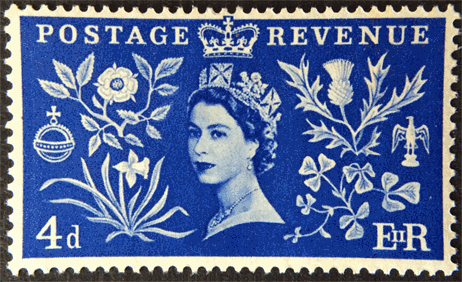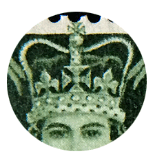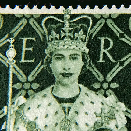 On remarque, en l'observant à la loupe, que la croix au sommet de la couronne de la Reine empiète sur le bord dentelé du timbre. Peut-être une facétie ou une sorte de marque du dessinateur, que l'on retrouve d'ailleurs ci-dessous. |
