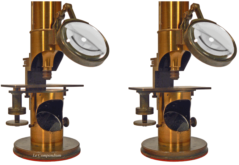 Ce microscope a subi une modification probablement après sa sortie des ateliers Oberhaeuser. Il s'agit de l'adjonction d'un dispositif de mise au point par molette entraînant une tige filetée reliée, par une pièce en forme de fourche, à la collerette du tube optique. |