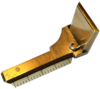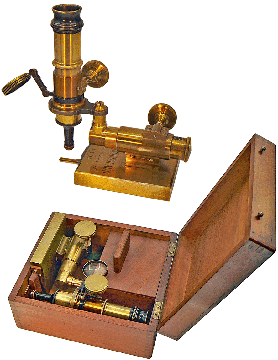 Ce microscope demeure mystérieux. L'objectif, au grossissement modulable et modéré, surmonte un élément amovible, actuellement maintenu à l'avant du socle de l'instrument par une patte façonnée en queue d'aronde. Cet élément porte une petite règle en ivoire de 2 centimètres, graduée en millimètres et un minuscule crochet pivotant sur lui-même. |