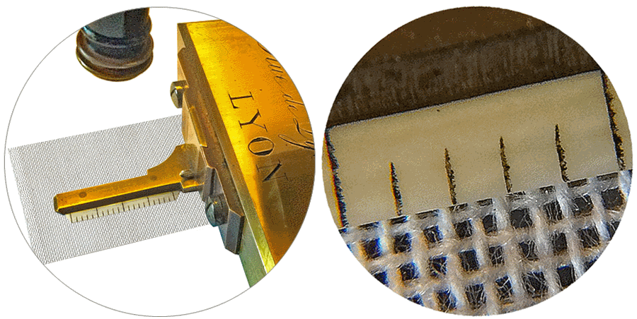 La région lyonnaise est une région de soierie et nous avons pensé qu'il pouvait s'agir d'un microscope utilisé pour vérifier le nombre de fil au centimètre de cette matière, comme représenté ci-dessus à grossissement faible. Toutefois, la présence du crochet prend, pour nous, la forme d'un point d'interrogation. Mais il peut avoir été disposé là pour y faire glisser un fil et le tendre un peu afin d'apprécier sa texture... |