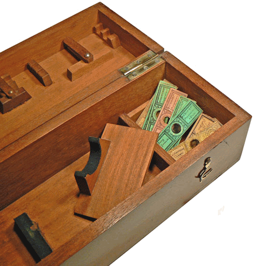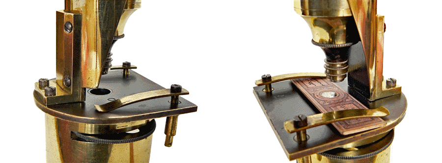 Quelques lames préparées du milieu et de la deuxième partie du XIXe siècle accompagnent le microscope. Elles sont signées Charles Bourgogne, Bourgogne Frères, Bourgogne & Alliot ou encore Joseph Bourgogne pour la plus ancienne. |
