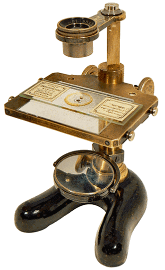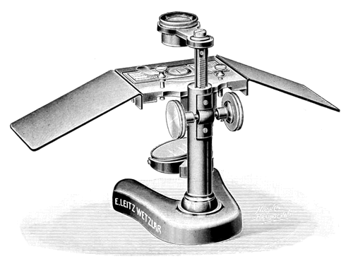 L'instrument est utilisé pour la dissection d'objets de petite taille ainsi que pour la réalisation et l'observation de préparations microscopiques ne nécessitant pas un fort grossissement. Il présente l'avantage sur le microscope composé de ne pas renverser les images et d'offrir une distance suffisamment importante entre l'optique et la platine pour permettre le passage des outils usuels du micrographe. Le modèle présenté peut revecevoir des appuie-mains comme le montre l'image du catalogue. L'optique est proposée sous forme d'associations de lentilles qui offrent d'excellentes images pour des grossissements de 10 ou 20 fois. La mise au point s'effectue par système à pignon et crémaillère. |