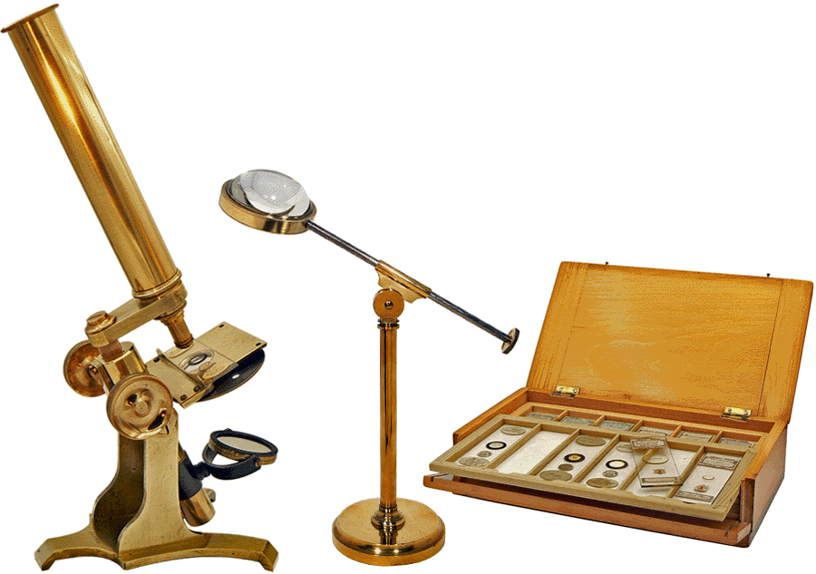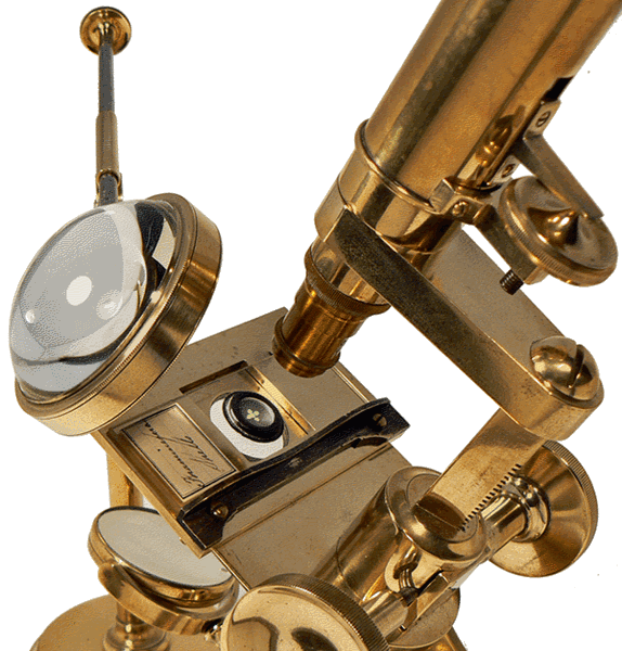 La préparation de foraminifères, placée sur la platine du microscope, n'est pas transparente. Elle nécessite pour être observable un éclairage de surface. Avant l'apparition de l'ampoule à incandescence, c'est la lumière solaire ou celle des lampes à pétrole que l'on concentrait et focalisait sur l'objet examiné en utilisant le condenseur sur pied. Le dispositif, peu commode, a disparu avec les appareils d'éclairage électrique construits spécialement pour l'observation. |