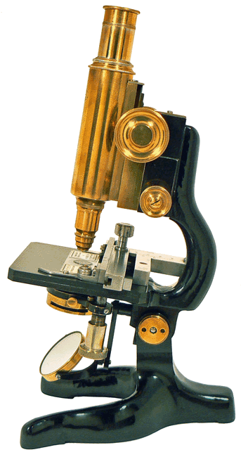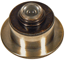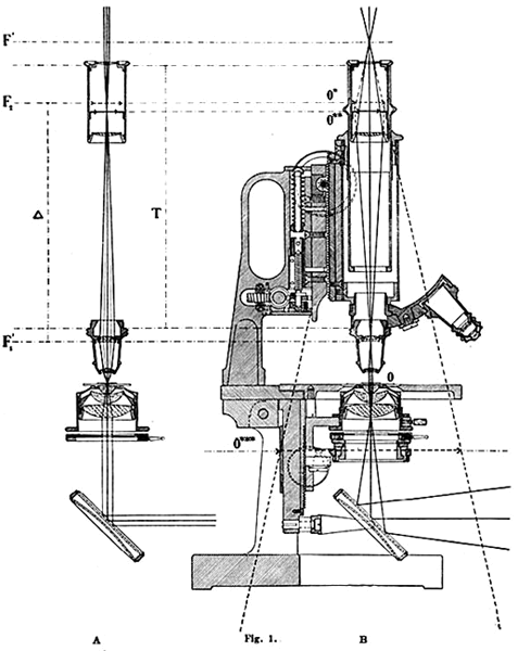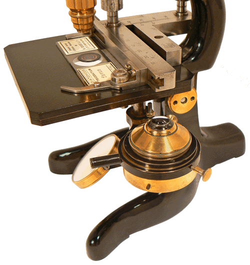 Dans le condenseur ordinaire, tel que ci-dessus ou monté sur le microscope photographié à droite, les rayons lumineux réfléchis par le miroir traversent deux ou trois lentilles qui concentrent la lumière sur la préparation placée sur la platine du microscope. L'objet et éclairé et observé par transparence. |