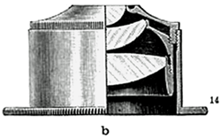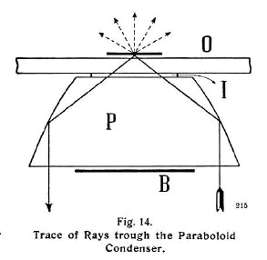 A gauche, l'image du catalogue Carl Zeiss de 1913 montre comment un rayon lumineux entrant dans la zone annulaire de la base du condenseur parabolique à fond noir - la zone centrale B réfléchissante interdit toute entrée de la lumière - frappe latéralement l'objet sans pénétrer dans l'objectif du microscope. Les particules éclairées deviennent lumineuses et se détachent sur le fond noir de la surface du condenseur. Le contraste important permet de mettre en évidence leur présence même si leurs contours demeurent quelquefois imprécis. |