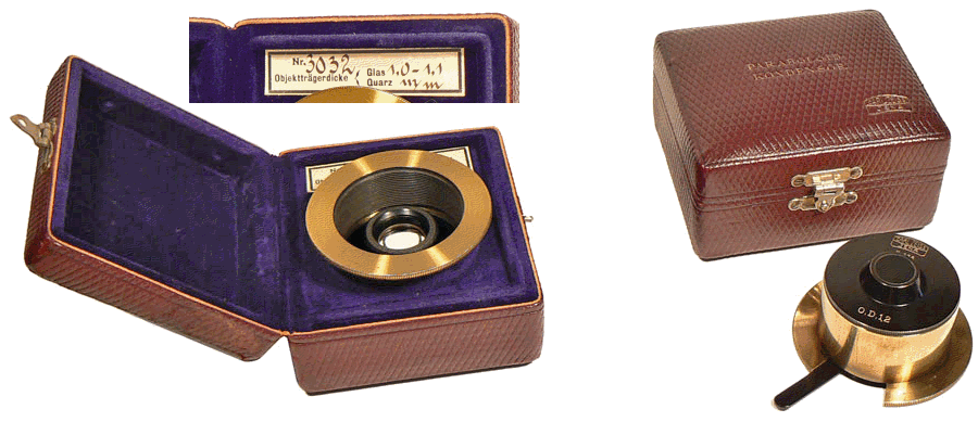 Deux condenseurs paraboliques à fond noir de la société CARL ZEISS. L'un d'eux est rangé dans son écrin. On distingue l'espace annulaire, non réfléchissant, par lequel la lumière peut entrer dans le bloc optique. |