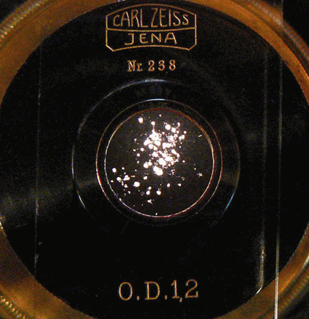 La photographie, à droite, montre une lame porte-objet placée au dessus du condenseur parabolique à fond noir et sur laquelle ont été déposés des cristaux finement concassés de chlorure de sodium. A l'oeil nu, chaque parcelle de sel devient fortement lumineuse et donc repérable. |