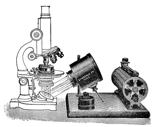 La lumière, en microscopie, joue un rôle important. Aussi, les instruments sont souvent dotés d'un appareil d'éclairage composé d'un miroir, d'un diaphragme et d'un condenseur, le but étant de focaliser la lumière sur la préparation. |