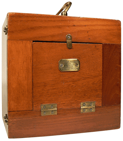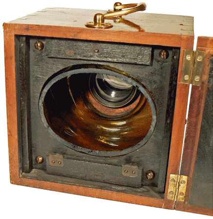 L'ouverture ovale et rodée de la chambre en verre permet d'y appliquer d'abord une plaque en verre dépoli pour effectuer la mise au point puis ensuite la plaque en verre transparent qui sera recouverte de l'émulsion sensible et, la prise de vue étant réalisée, des bains de développement et de fixation. Notre appareil permet de réaliser des clichés ovales de 10 x 7 cm.