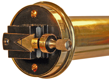 Le bouton gradué commande le déplacement de la lentille interne positionnée entre la fente et le prisme lors de la mise au point de l'image du spectre. Le prisme de Cornu utilisé pour la dispersion est constitué par deux demi-prismes en quartz droit et gauche accolés. Il permet d'obtenir un spectre couvrant l'ultra-violet et le visible, c'est-à-dire les longueurs d'onde de 185 à 800 nanomètres (1 nm = 10-9 m). Lorsque l'on utilisait cet appareil, bien avant la mise en place du système international d'unités (SI), les longueurs d'onde étaient exprimées en angstrœms (symbole Å), tels que 10 Å = 1 nm. |