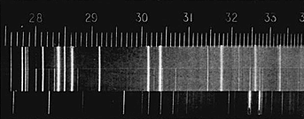 Les photographies des spectres sont obtenues sur des plaques de 10,7 x 8,2 cm placées dans un châssis en acajou. Le déplacement vertical et repérable du châssis permet d'enregistrer plusieurs spectres sur la même plaque. Une échelle micrométrique superposée au spectre permet de déduire les longueurs d'onde à partir de la position des raies d'éléments connus. |