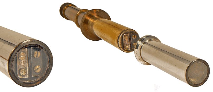 La partie essentielle est un spectroscope à vision direct dont la fente et les composants optiques internes sont protégés par une enveloppe cylindrique à l'extrémité en verre, donc transparente. Ce spectroscope est construit à partir d'une combinaison d'Amici probablement formée de 5 prismes, ce qui engendre une bonne dispersion. L'oculaire micrométrique permet de superposer une échelle graduée au spectre lumineux . L'image obtenue, en absence de toute substance absorbante, est la suivante : |