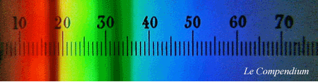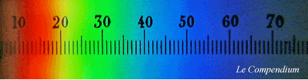 Sur l'image qui suit, le phénomène d'absorption se traduit - c'est un exemple - par deux bandes de largeurs et d'intensités inégales : l'une est située dans la zone rouge-orangée et l'autre dans la zone vert-bleue du spectre de la lumière blanche. Les zones sombres indiquent des maxima d'absorption pour les graduations 18 et entre 32 et 33 de l'échelle micromètrique. |