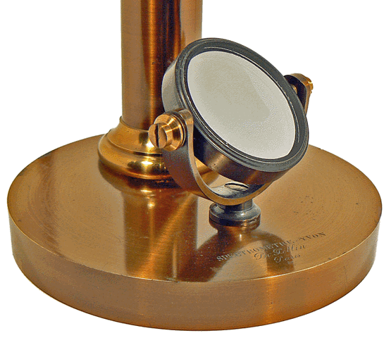 Cet appareil qui ressemble à un microscope... n'en est pas un. Il s'agit d'un spectromètre utilisé pour étudier l'absorption de certaines composantes de la lumière blanche lorsque cette dernière traverse une substance liquide. Le phénomène se traduit par l'apparition, sur l'image du spectre lumineux, de zones sombres appelées "bandes d'absorption" qui permettent souvent de déceler la présence de certains corps en solution. Il est possible, par exemple, que le "spectromètre Yvon" présenté, construit par la maison Ph. PELLIN à la fin du 19e siècle, ait été destiné à l'examen du sang afin de déceler, rapidement, la présence de composés anormaux à la suite d'un empoisonnement ou d'une asphyxie... |